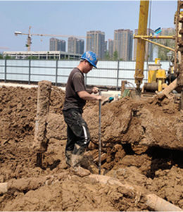 將探桿插入打好的樁孔中,用垂線測(cè)出到地面的長(zhǎng)度。